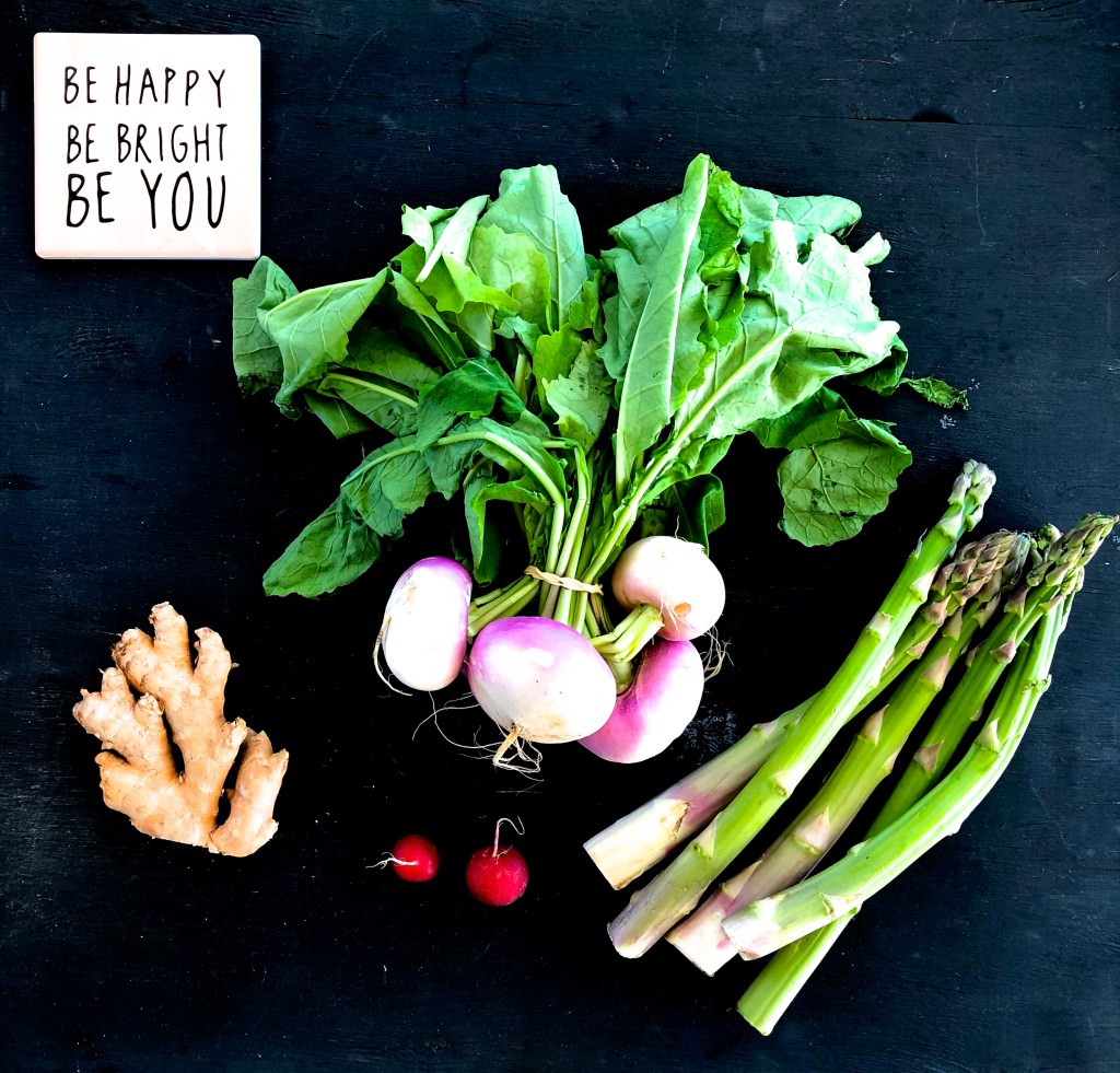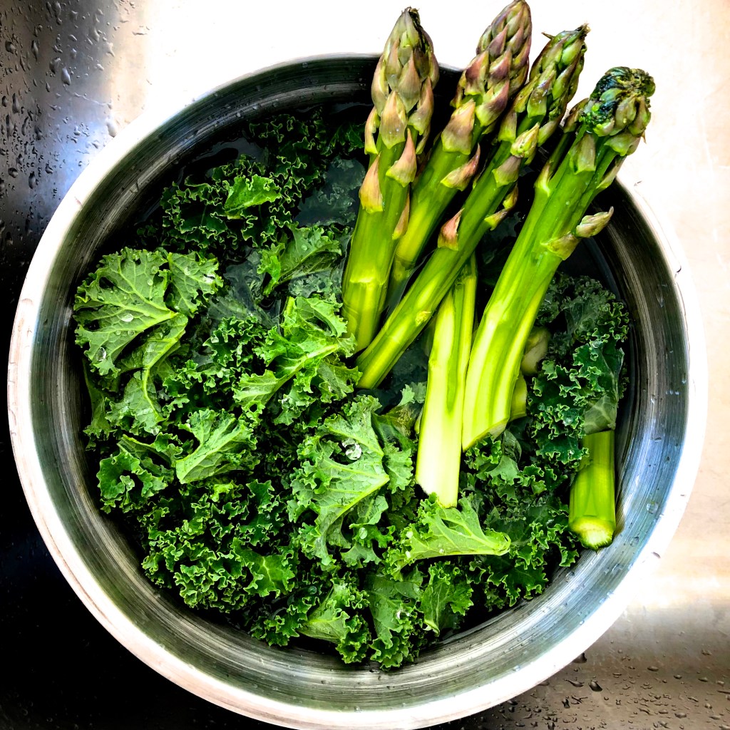 Pendant ce temps, je lave le chou kale et le débarrasse de sa partie centrale, je lave les asperges et coupe les queues, j’épluche et je lave les navets.