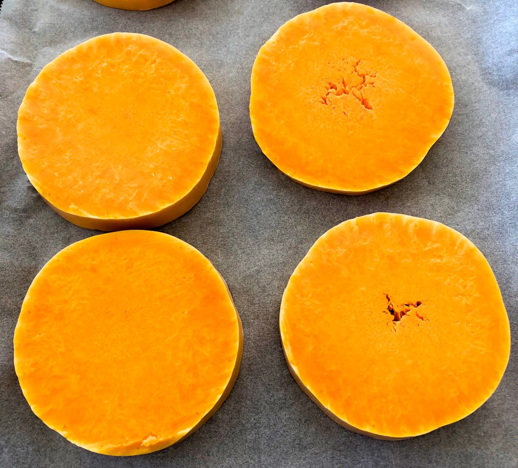 je commence par trancher la courge butternut en rondelles de 2 cm environ, les badigeonne d’huile de coco et les mets au four pour 15 minutes.