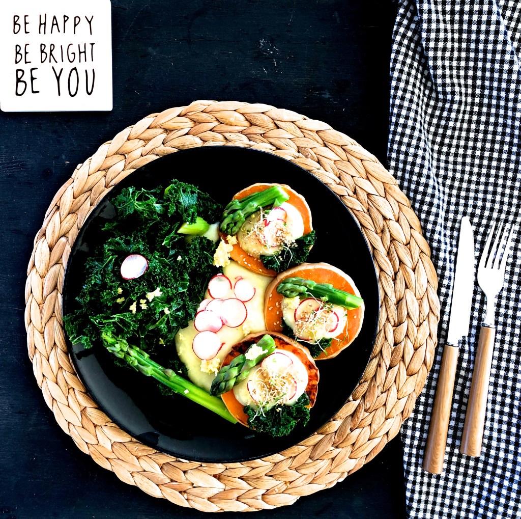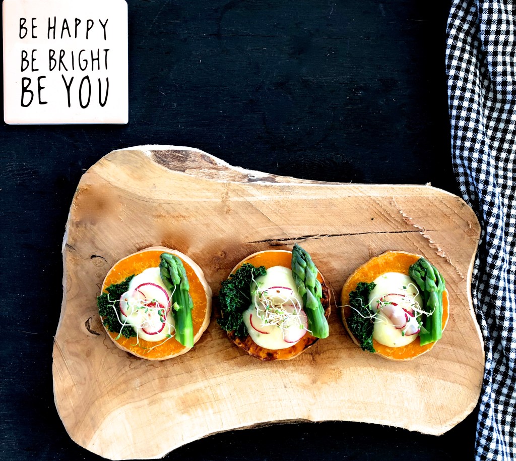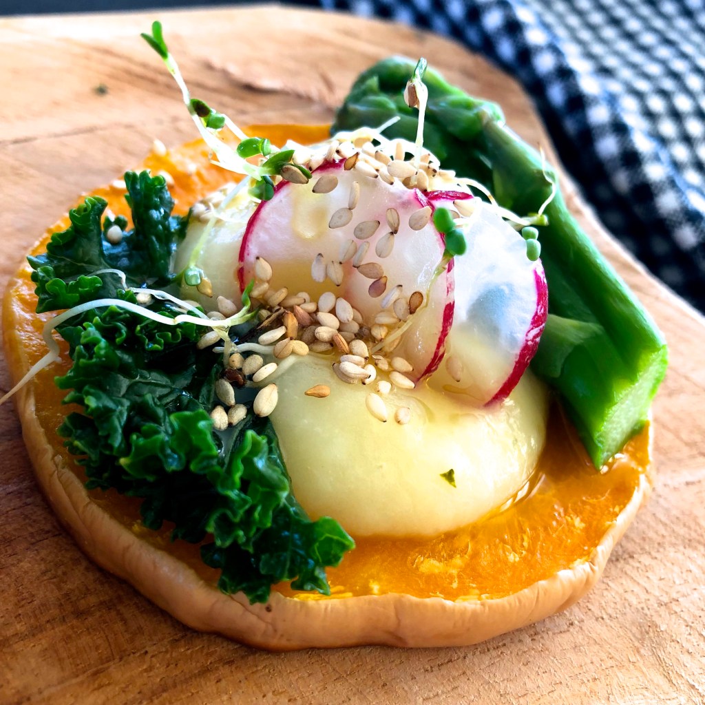 Puis lorsque le butternut est cuit, je dispose les jolis toasts dans une assiette, et les garnis de purée de navets, de chou kale, de pointes d’asperges, de quelques rondelles de radis roses et de graines germées.